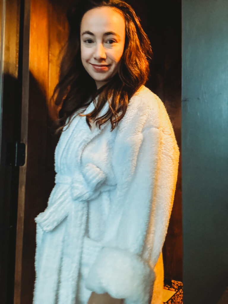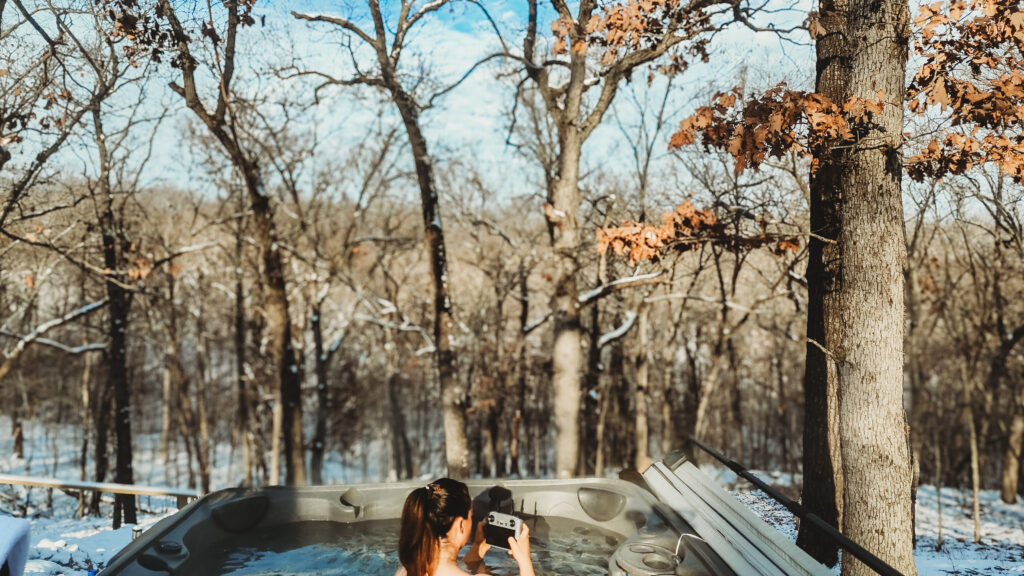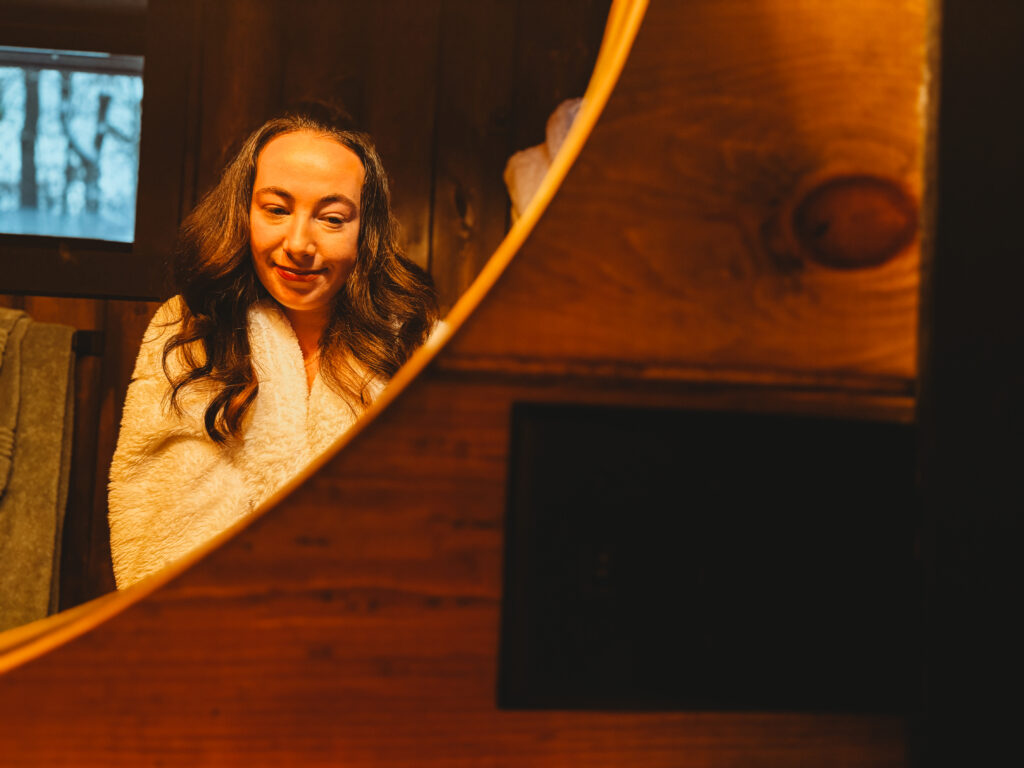 The heart of the stay was the outdoor hot tub overlooking the snowy forest. There’s something magical about sinking into warm water while snowflakes dust the pines—both energizing and grounding at once.